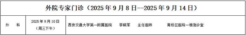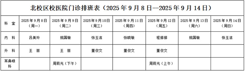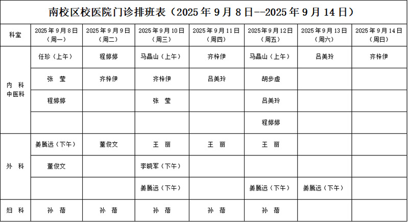 备注:9月8日至9月12日,南校区新生体检。排班如有临时变动,请参照门诊实际情况。