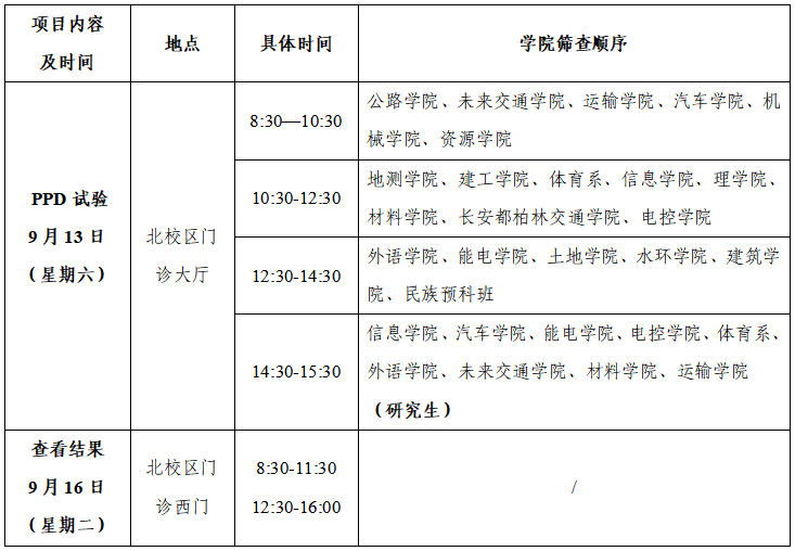 根据《陕西省学校结核病防控工作规范(试行)》要求,结合我校工作实际,定于9月13日以结核菌素皮肤试验(PPD试验)的方式,开展结核病筛查工作,筛查对象为北校区全体2025级本科生、研究生。现就具体工作安排如下: