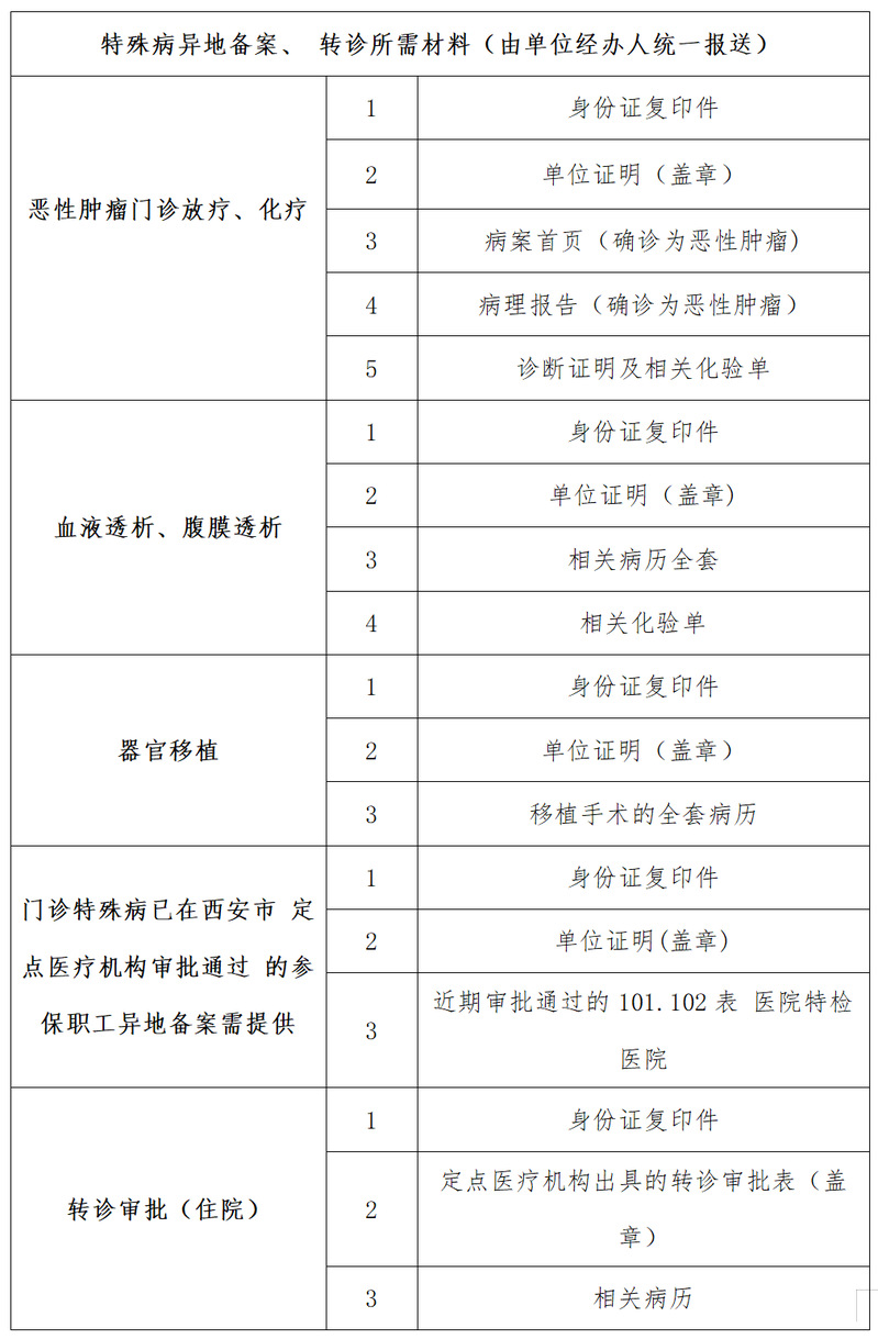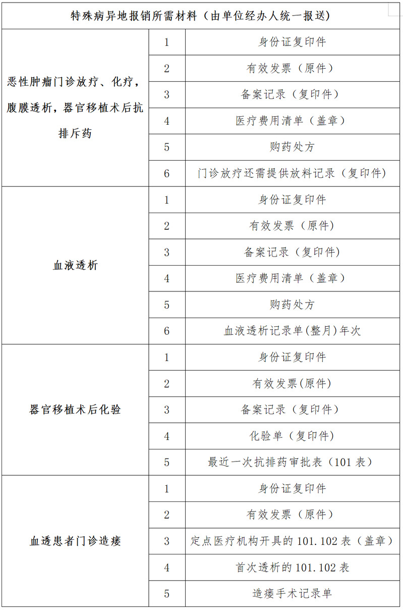 1.首次备案:根据不同门诊特殊病种提供住院病历、病理报告、诊断证明及其他要求的检查报告等医疗资料原件;单位出具的异地就医情况说明加盖单位公章(注明异地就医原因)。一次备案有效期一年。对于符合该门诊特殊病种审核标准的患者发生的门诊特殊病种费用,每三个月手工报销一次。