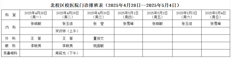 下周(4月28日至5月4日期间)校医院门诊安排通知如下: