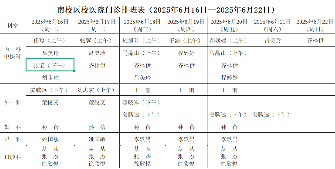 下周(6月16日至6月22日期间)校医院门诊安排通知如下: